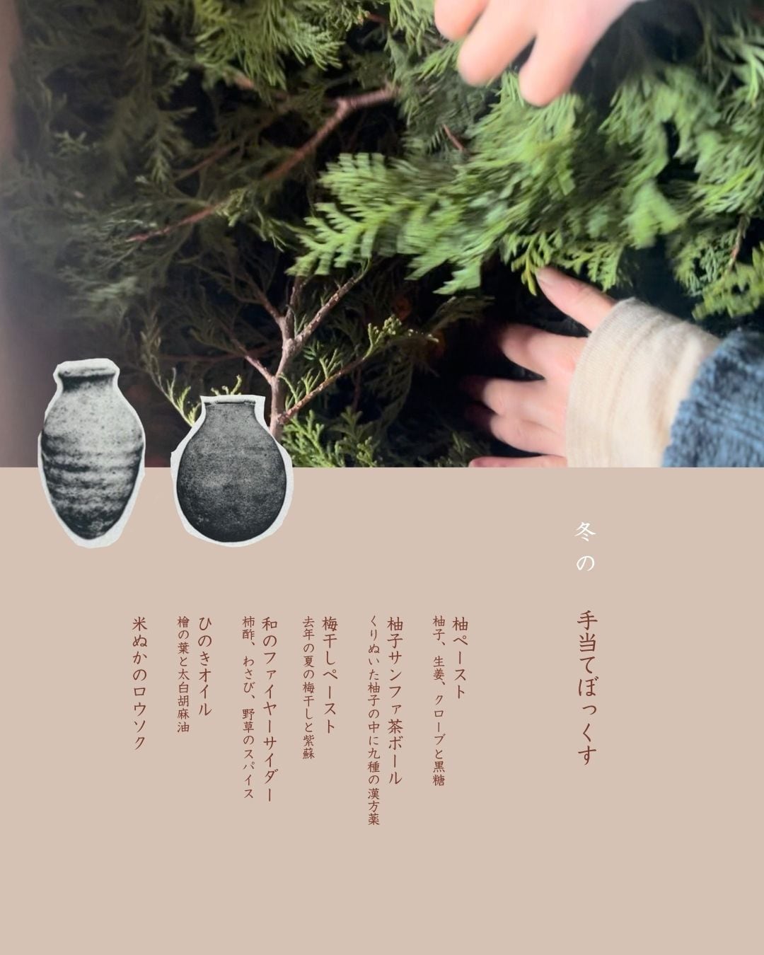 手当てボックスは季節限定の少量生産で、今この瞬間のために丁寧に作られたレメディーのセットです。ここでは、土地と手仕事を通して生まれる創造を形にしています。