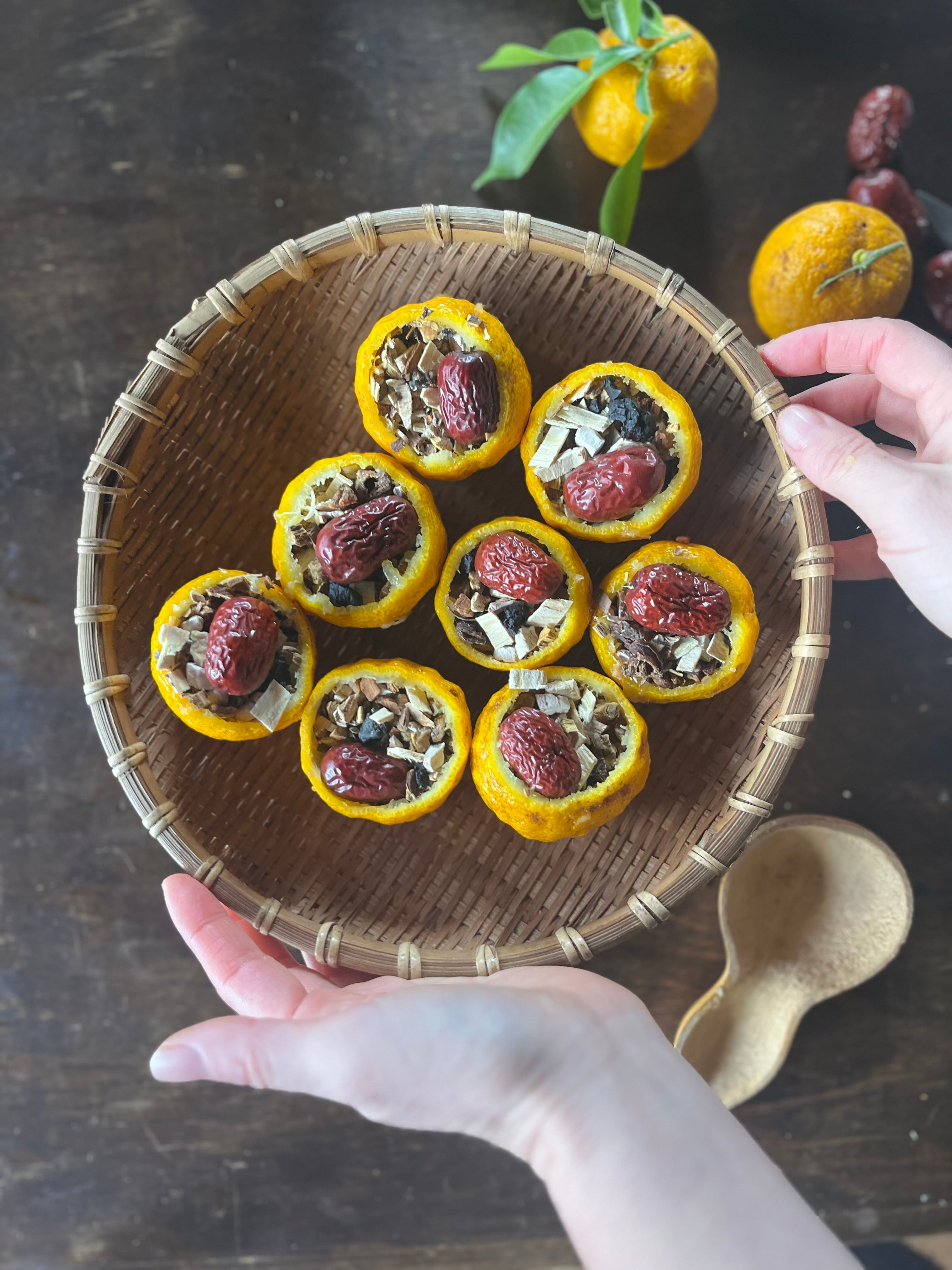 くり抜いた柚子の中に9種類の生薬を詰め、乾燥させました。香り高く、体を温める韓国茶です。1つのボールを数回お使いいただけます。